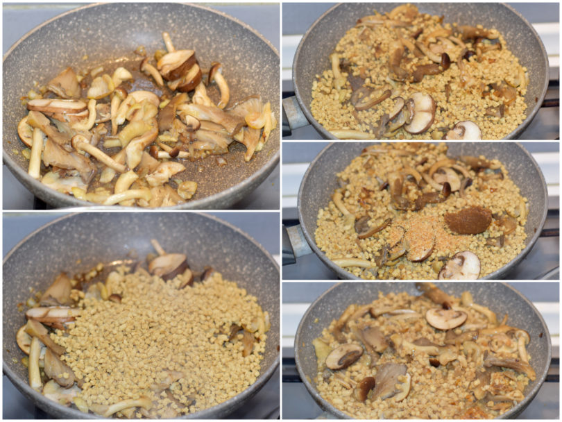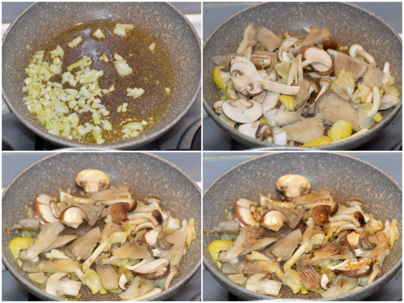 Innanzitutto mondate e tritate la cipolla e fatene appassire metà in padella antiaderente con un filo d'olio, poi unite anche i funghi (puliti e a fettine), lasciate insaporire, poi sfumate con la salsa di soia.