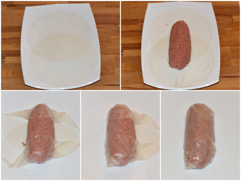 Bagnate velocemente la carta di riso nell'acqua, disponete i fogli in un piatto sovrapponendoli tra loro, quindi posizionate al centro il composto, dando una forma allungata tipo polpettoncino.