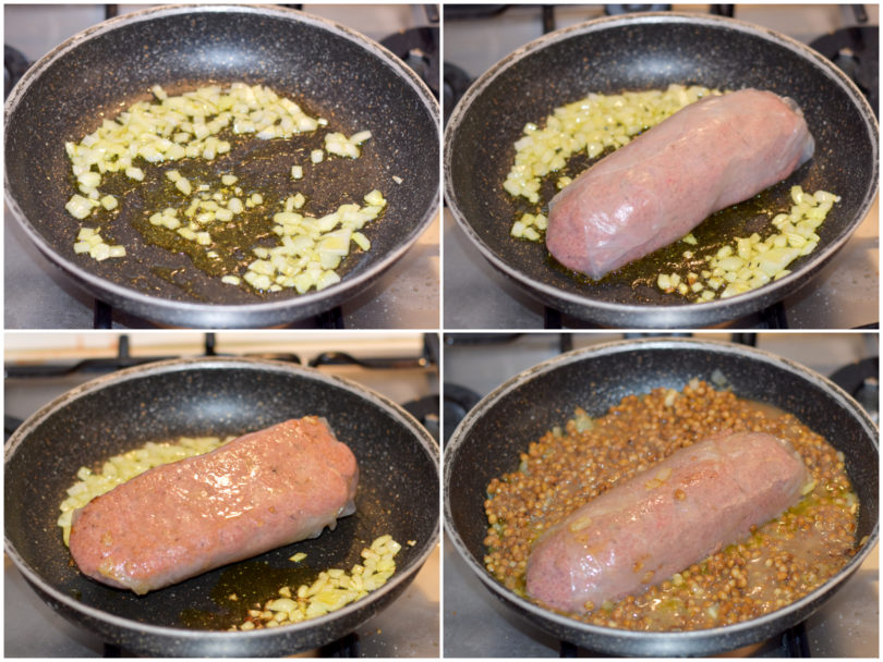 Fate appassire la cipolla rimasta in padella antiaderente con olio, unite il finto cotechino e lasciatelo rosolare su tutti i lati, poi aggiungete le lenticchie cotte, aggiustate di sale e lasciate insaporire e asciugare.