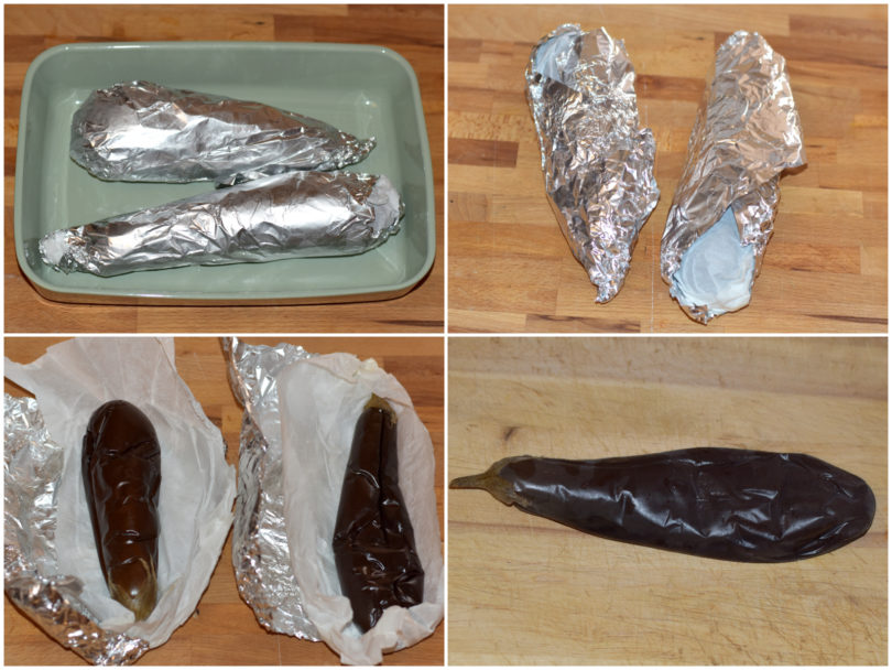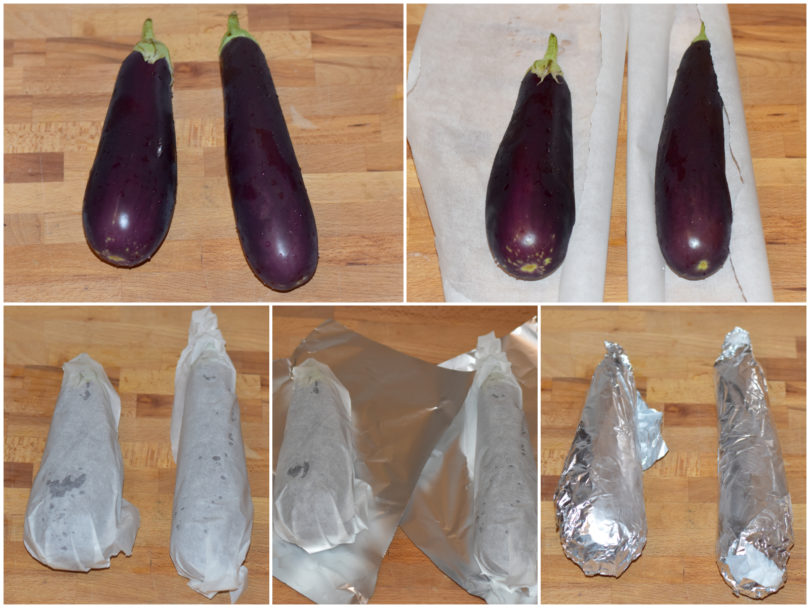 Lavate bene le melanzane, avvolgetele prima con carta forno e poi anche con carta di alluminio, quindi cuocetele per circa 30 minuti in forno ventilato preriscaldato a 200°C.
