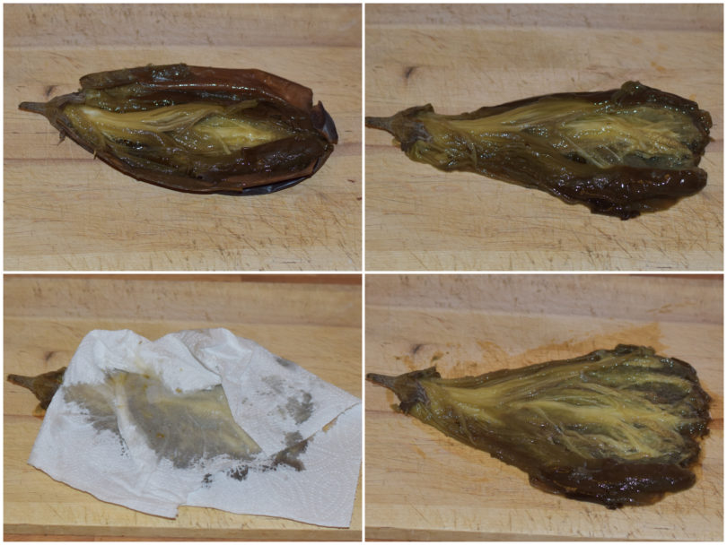 Delicatamente, aiutandovi con un coltello, eliminate la buccia, almeno in parte, quindi aprite la melanzana a ventaglio e schiacciatela per ricordare una sorta di fetta di carne.