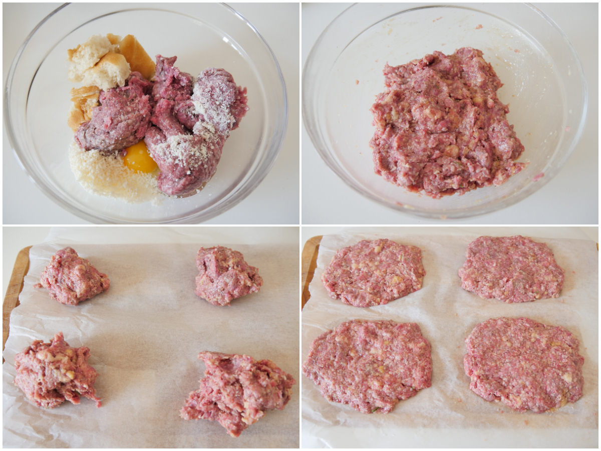 Impastate fino ad ottenere un composto omogeneo, quindi dividete il composto in 4 parti uguali, formate delle palline e schiacciatele per formare una sorta di hamburger.
