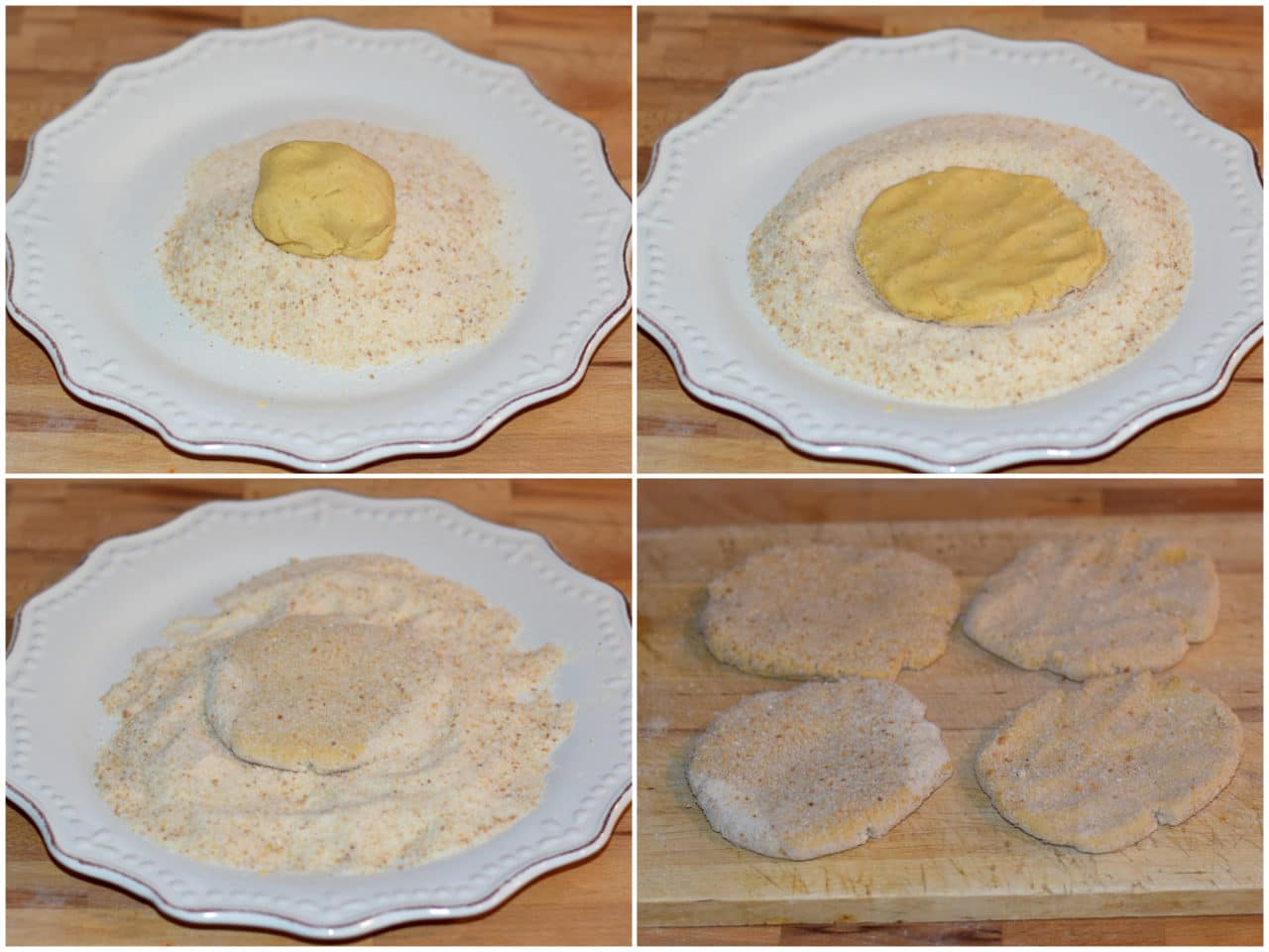 Prendete una manciata di composto per volta, appiattitelo direttamente dentro al piatto con il pangrattato per creare una cotoletta e impanarla.