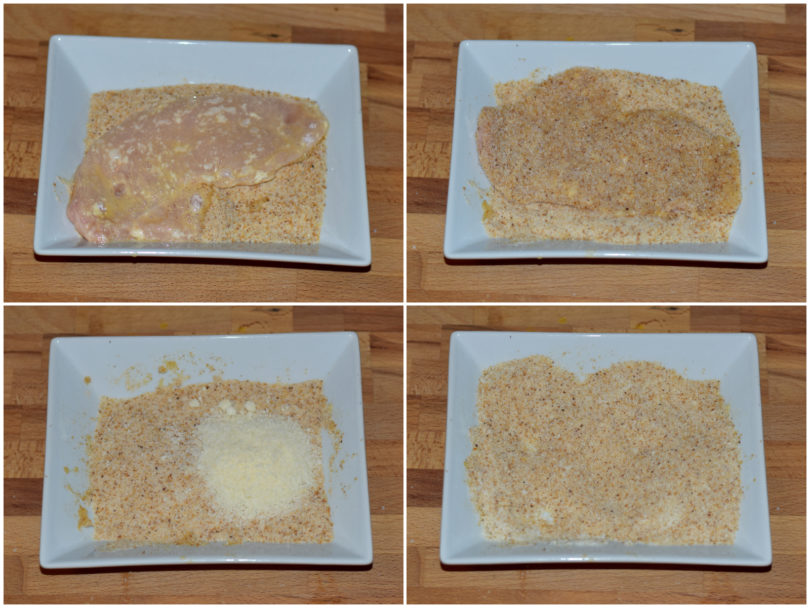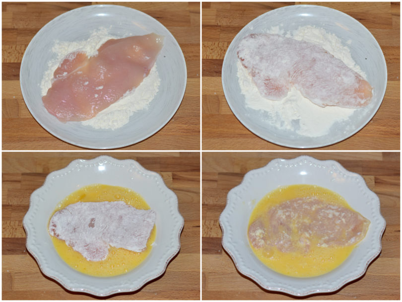 Passate le fettine di pollo prima nella farina, poi nell'uovo e infine nel pangrattato, cercando di impanarle in maniera uniforme.
