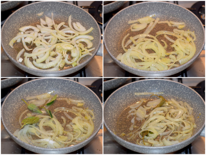 Mettetele in una padella antiaderente con un filo d'olio e lasciatele appassire a fiamma bassa, poi aggiungete salvia, alloro e zucchero e sfumate con vino e aceto, lasciando poi cuocere per circa 10 minuti o fin quando l'alcol non sarà evaporato e il fondo di cottura non si sarà ristretto.