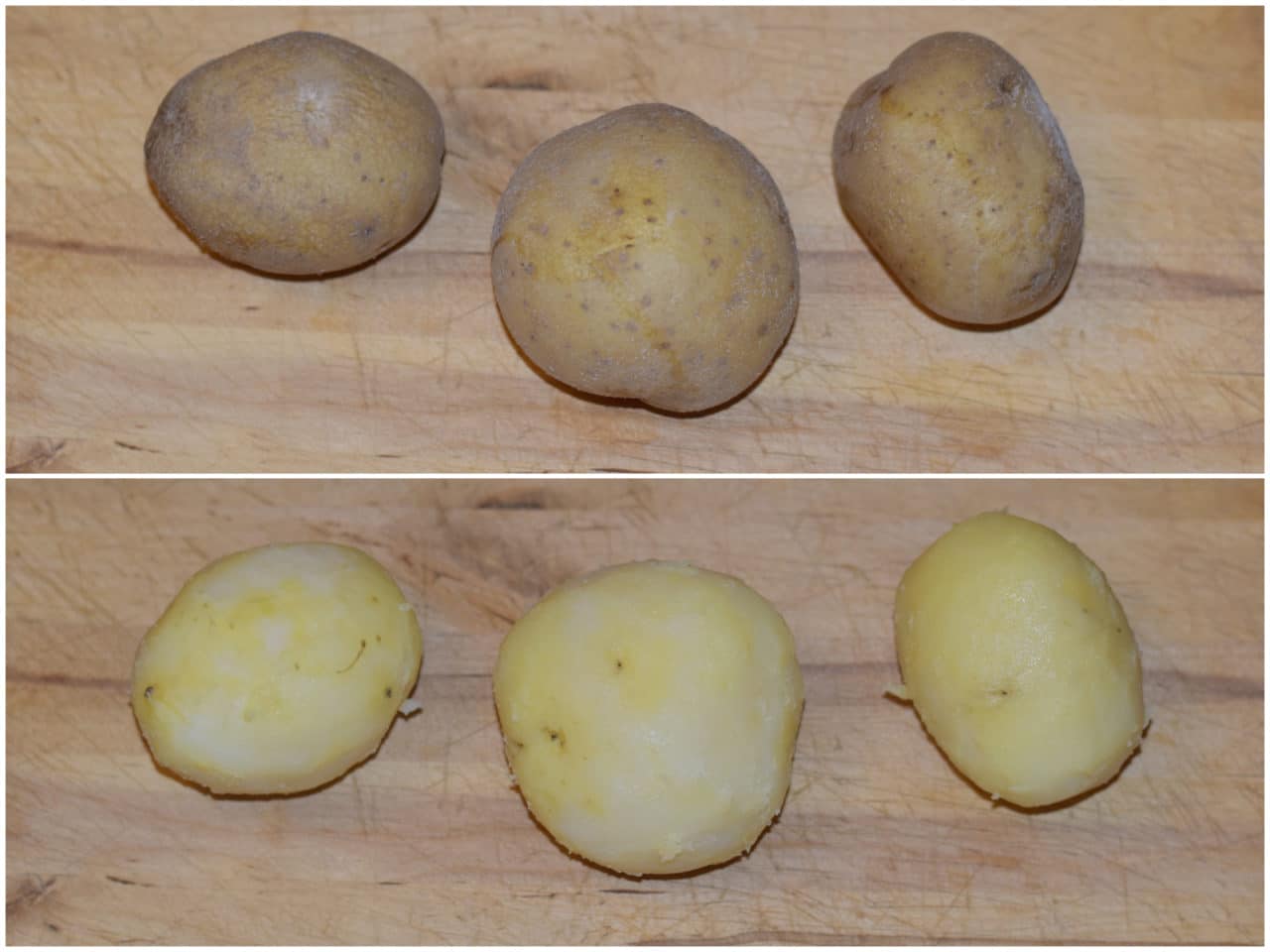 Innanzitutto lavate bene le patate, lessatele in acqua già bollente per circa 25-30 minuti, poi scolatele e pelatele subito.