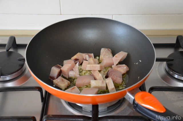 Aggiungere il pesce spada tagliato a tocchetti e far rosolare per qualche minuto.