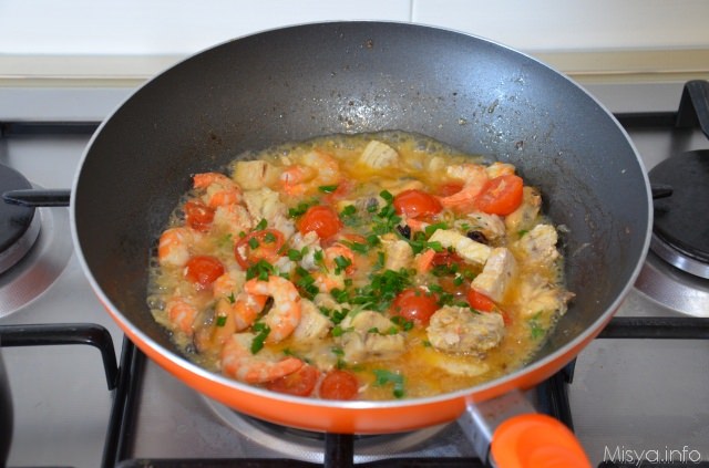Cuocere per una decina di minuti quindi aggiungere i gamberi sgusciati e privati della testa e un bicchiere di brodo di pesce.