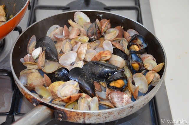 In una padella a parte fate aprire le vongole e le cozze cuocendole a fiamma viva fino a che le valve non siano aperte
