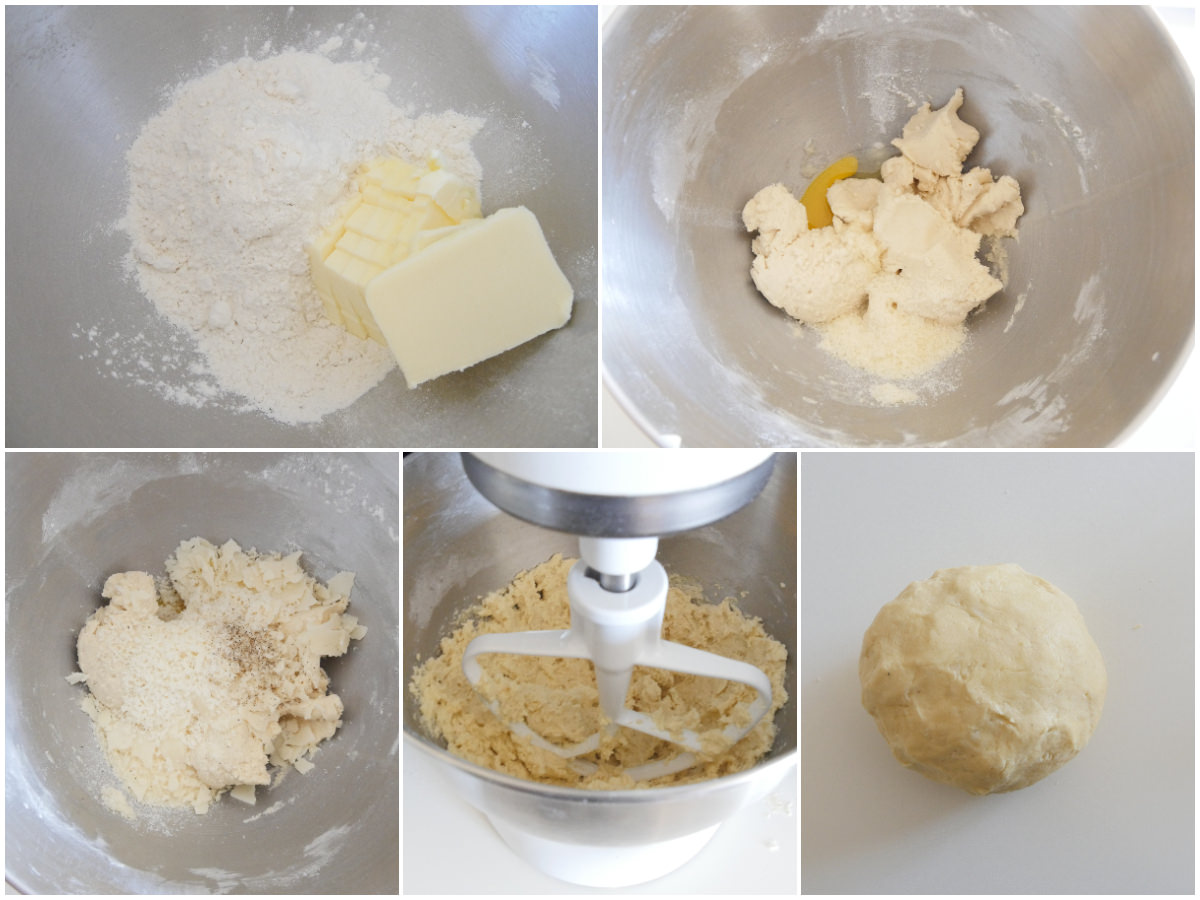 Mettete in una ciotola burro e farina e lavorate fino ad ottenere un composto sabbioso, quindi unite anche uova, parmigiano e emmental, sale (poco, perché i formaggi sono saporiti) e se volete pepe (secondo me ci sta molto bene).