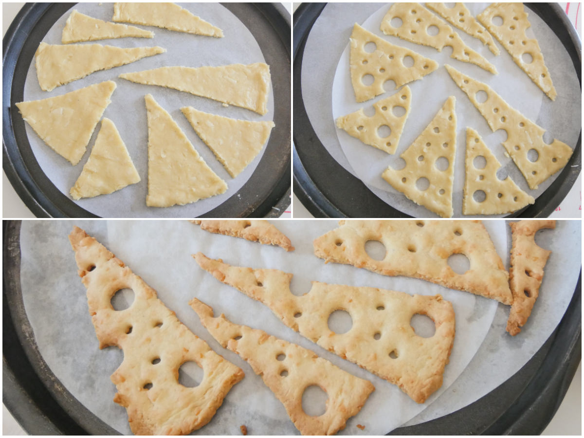 Adagiate gli spicchi su una teglia rivestita di carta forno e ricavate dei buchini di un paio di dimensioni diverse (potete usare una cannuccia e un tappino, ad esempio), in modo da simulare i buchini tipici dell'emmental.