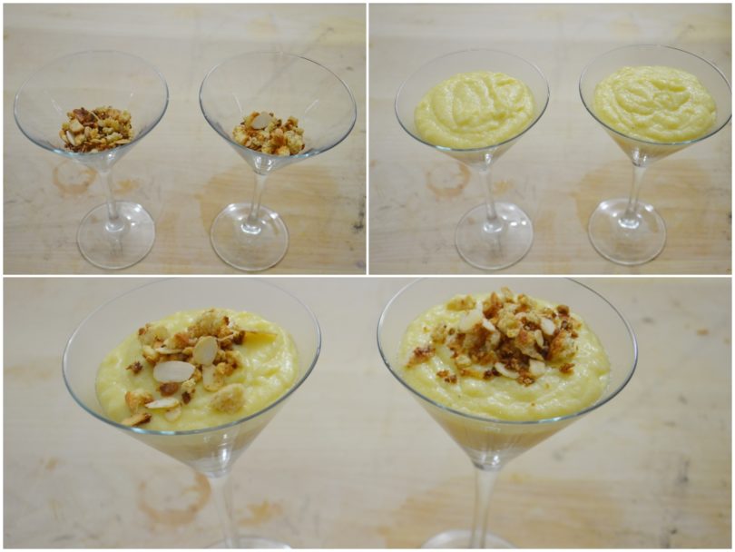 Prendete ora delle coppette, mettete sulla base un paio di cucchiai di cubetti di pandoro, poi versateci sopra la crema al rum.