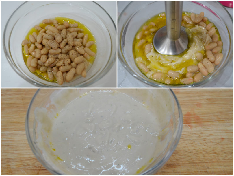 Mettete i fagioli in una ciotola con sale, pepe, olio e un po' di fondo cottura delle vongole, quindi iniziate a frullare con un minipimer, aggiungendo altra acqua di cottura se serve per raggiungere la consistenza che preferite.