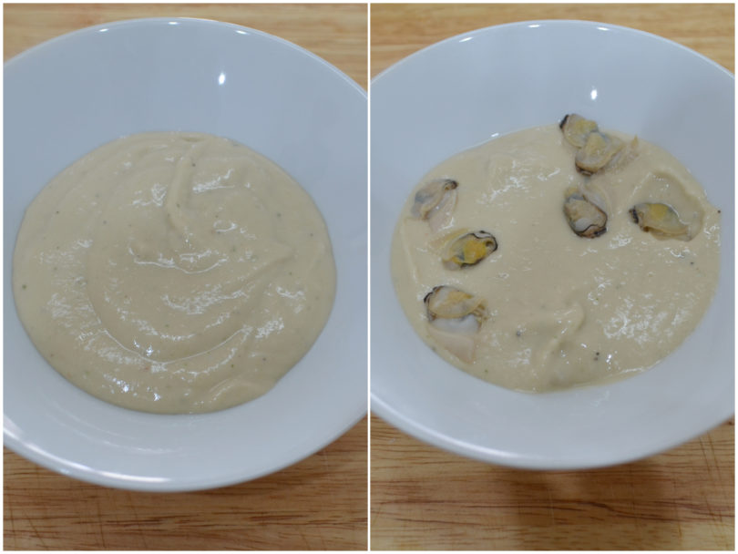 Versate la crema in un piatto e aggiungete le vongole sgusciate.