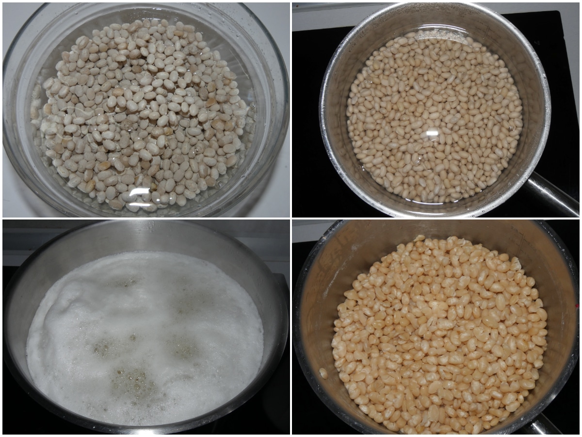 Tenete a bagno i fagioli per tutta la notte o comunque almeno 8 ore, quindi scolateli, sciacquateli e lessateli per circa 1 ora con acqua abbondante e non salata: quando saranno belli morbidi scolateli.