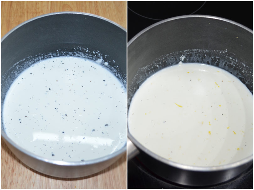 Versate in un pentolino latte e panna e aggiungete i semi di vaniglia e la buccia di limone. Aggiungete anche il baccello di vaniglia inciso e svuotato dei semi.