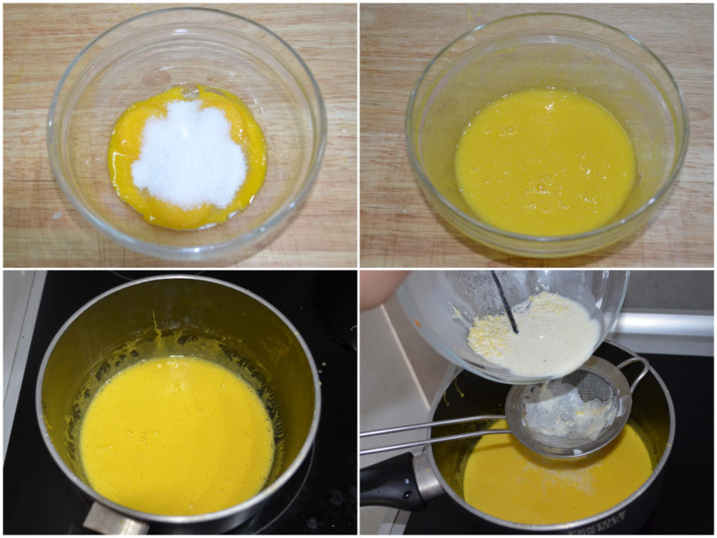 A parte, sbattete leggermente i tuorli con lo zucchero e metteteli in un altro pentolino.