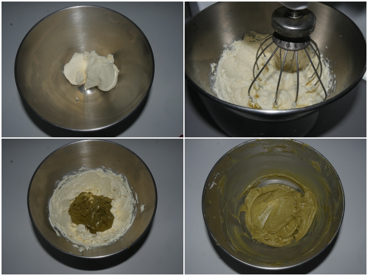 Montate il mascarpone con le fruste, quindi incorporate la crema di pistacchi.
