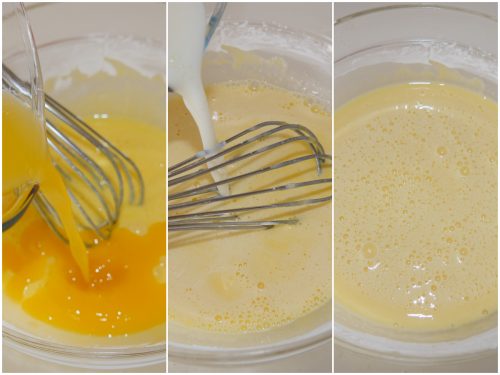 Mescolando con una frusta, unite anche succo di arancia e latte.
