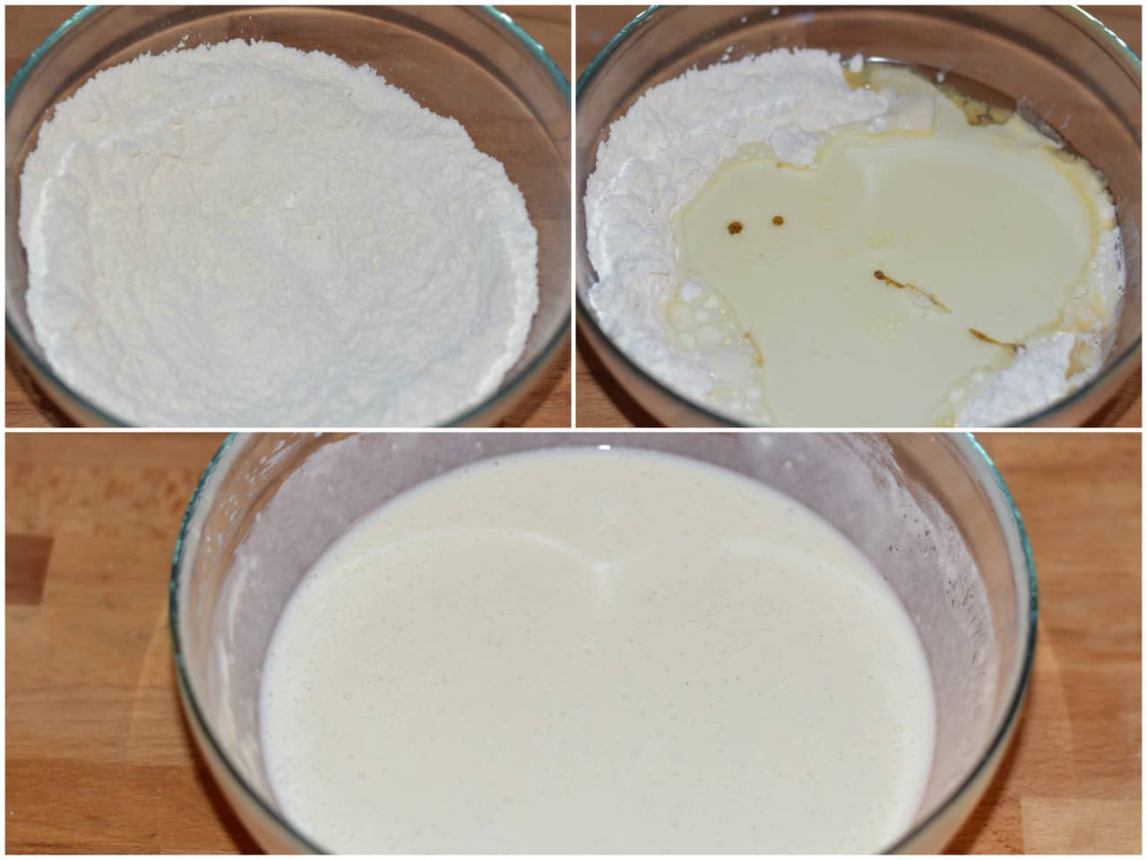 Unite in una ciotola farina setacciata, latte, olio, sale e vaniglia e lavorate bene con una frusta fino ad ottenere una pastella liscia e senza grumi.