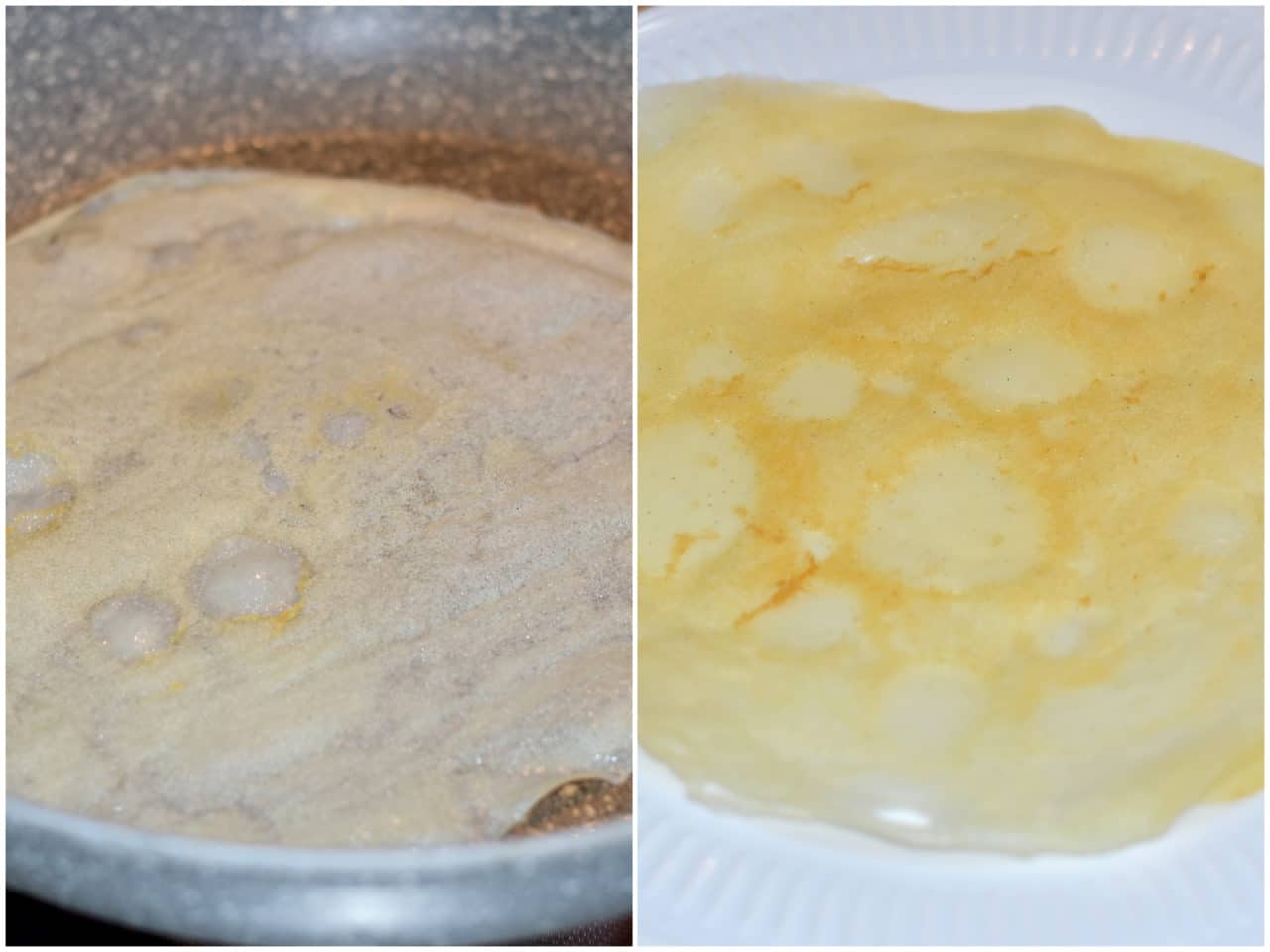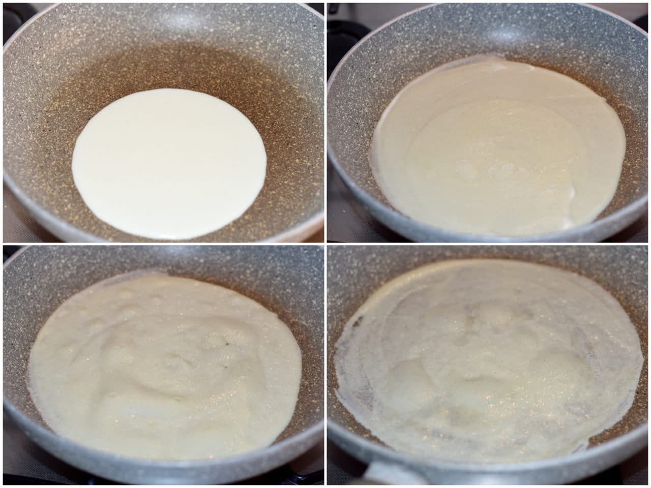 Fate scaldare una buona padella antiaderente dal fondo piatto, ungetela spennellandola con pochissimo olio di semi, quindi versateci dentro un mestolino di pastella e ruotate la padella per distribuirla uniformemente su tutto il fondo.