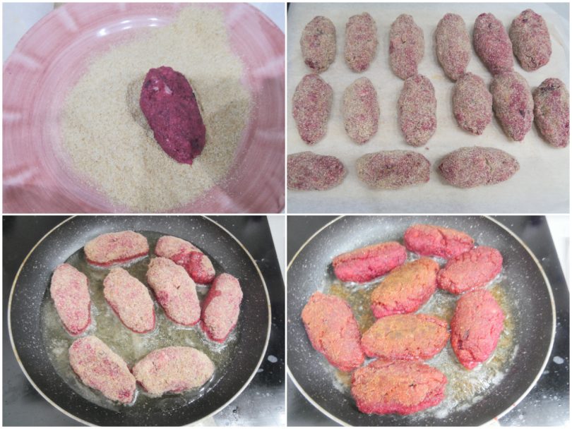 Con le mani inumidite, create delle quenelle di impasto, poi passatele nel pangrattato, quindi procedete con la cottura, in olio di semi ben caldo, girandole per farle dorare in maniera uniforme.