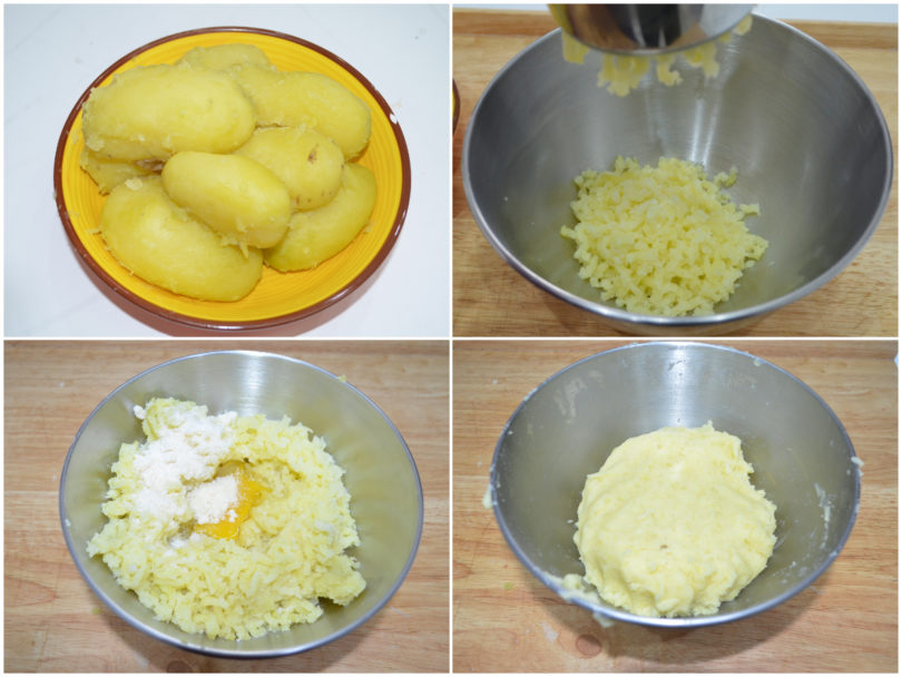 Schiacciatele con uno schiacciapatate, quindi unite uovo, parmigiano, almeno 1 cucchiaino abbondante di sale e pepe e amalgamate.
