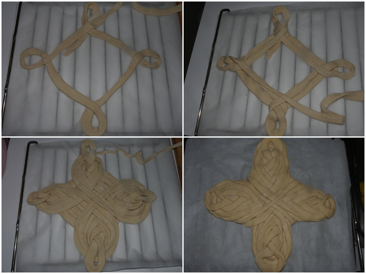 A questo punto viene la parte difficile, l'intreccio: poggiate della carta forno sul piano di lavoro o direttamente sulla teglia, quindi con un po' di cautela prendete una delle estremità della spirale e iniziate a creare la vostra croce, partendo da uno dei lati piatti, considerando che ogni lato dovrà essere di circa 15 cm.