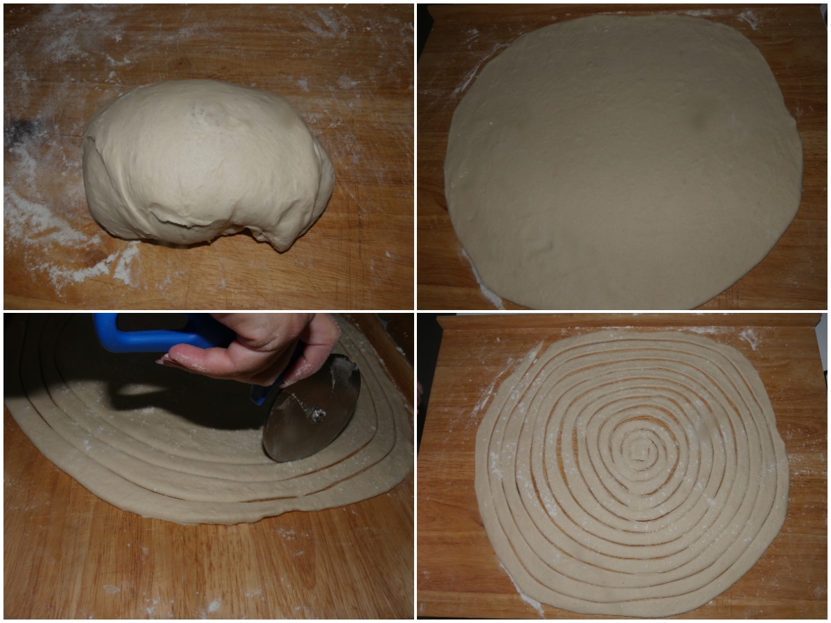 In sostanza, lasciate un pezzetto di impasto libero sulla teglia, create un anello sovrapponendo l'impasto su se stesso, lasciatelo allungare per 15 cm verso destra e avvolgetelo nuovamente su se stesso creando il secondo anello: continuate così per creare tutti e 4 gli anelli, quidni chiudete il giro sovrapponendo la striscia di impasto al pezzettino lasciato libero sulla teglia.
