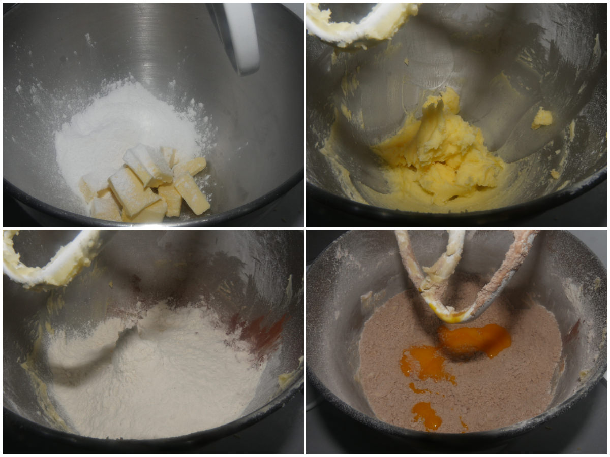 Innanzitutto preparate la frolla: lavorate burro e zucchero fino ad ottenere una consistenza a pomata, quindi incorporate farina, fecola e cacao e poi anche i tuorli.