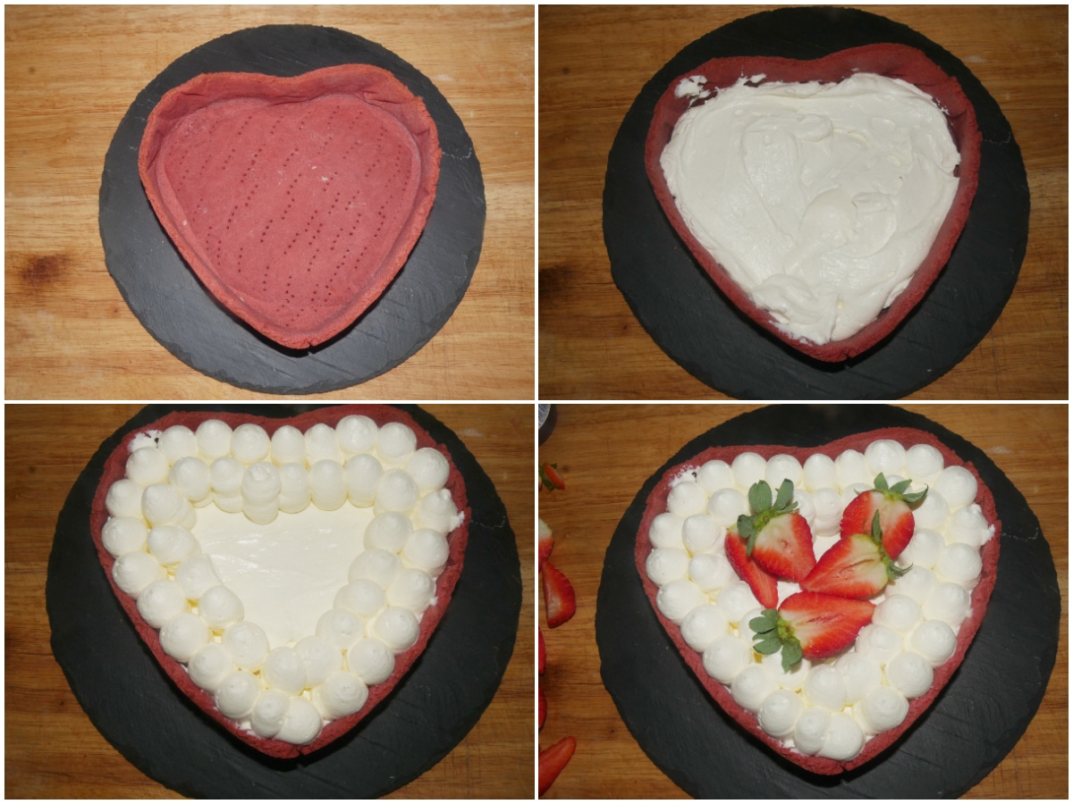 Trasferite il frosting in una sac-à-poche e farcite il guscio di frolla: io ho lasciato una parte un po' concava al centro, sempre a forma di cuore, per creare un decoro con le fragole.