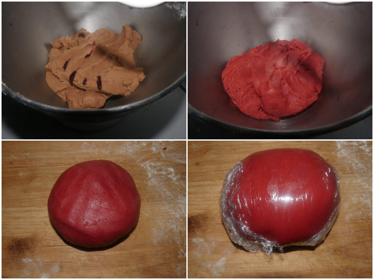 Alla fine aggiungete il colorante e amalgamate fino ad ottenere una colorazione omogenea, quindi avvolgete il panetto con pellicola trasparente e lasciatela riposare in frigo per almeno 30 minuti.