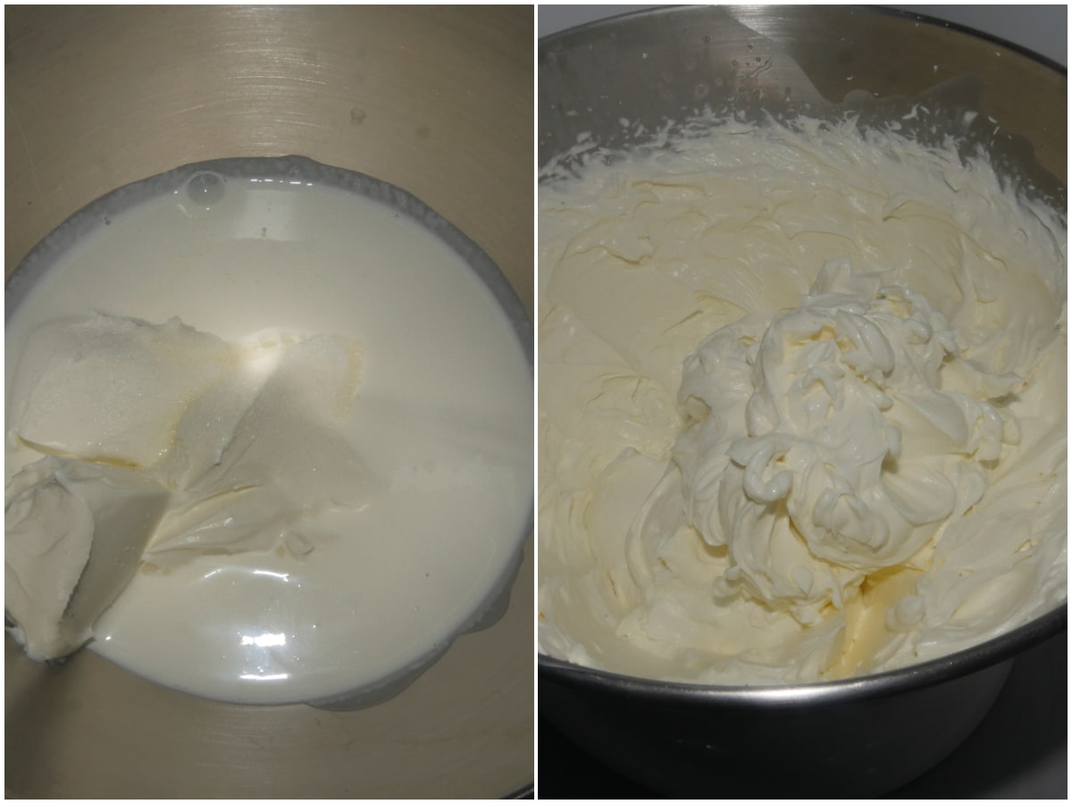 Per preparare il frosting al Philadelphia, versate semplicemente formaggio e panna in una ciotola e lavorate con le fruste fino ad ottenere un composto ben montato.