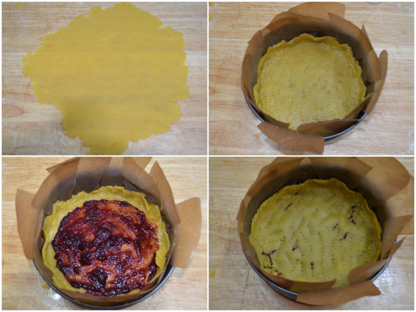 Rivestite lo stampo di carta forno, quindi iniziate a comporre la crostata.