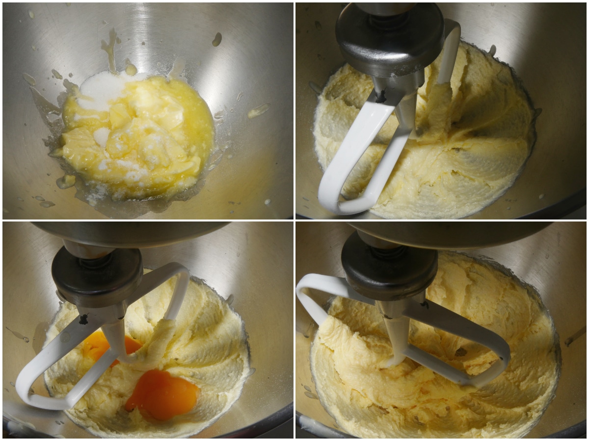 Preparate la pasta frolla: lavorate a crema il burro ammorbidito con lo zucchero e il sale, quindi incorporate uovo e tuorlo, poi anche farina e lievito.