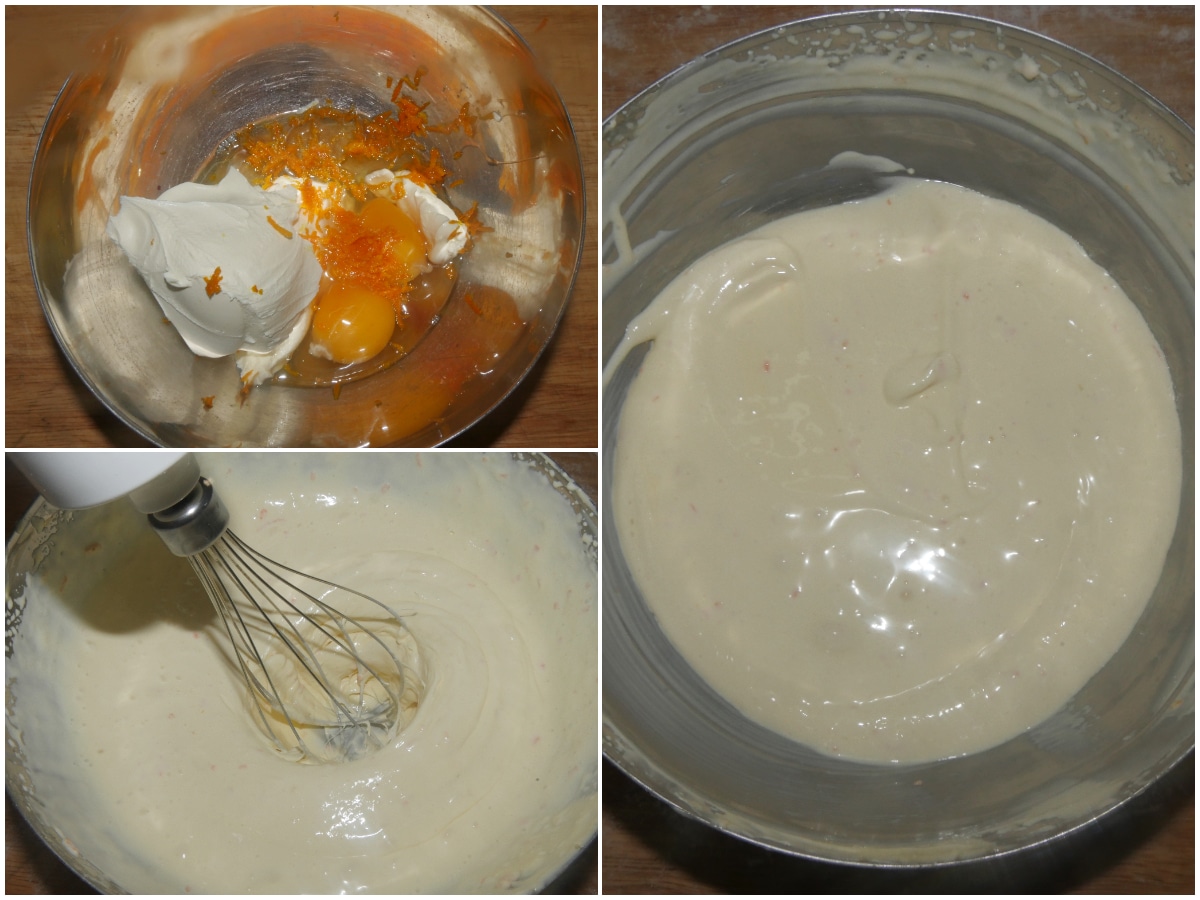 Preparate la crema lavorando con le fruste il mascarpone con zucchero, uova e buccia di arancia.