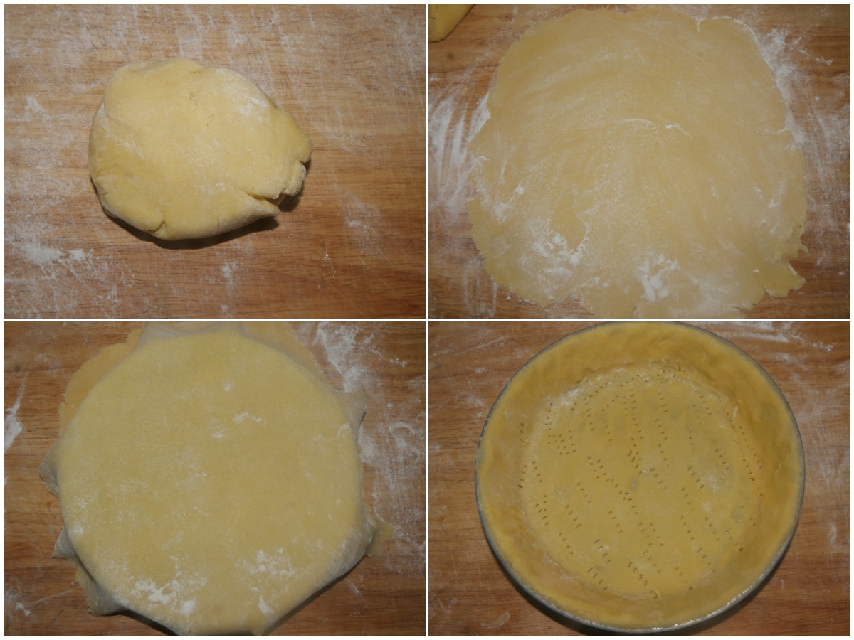 Disponete la prima sfoglia nello stampo imburrato e infarinato ricoprendo fondo e lati, pareggiate i bordi e bucherellate il fondo con i rebbi di una forchetta.