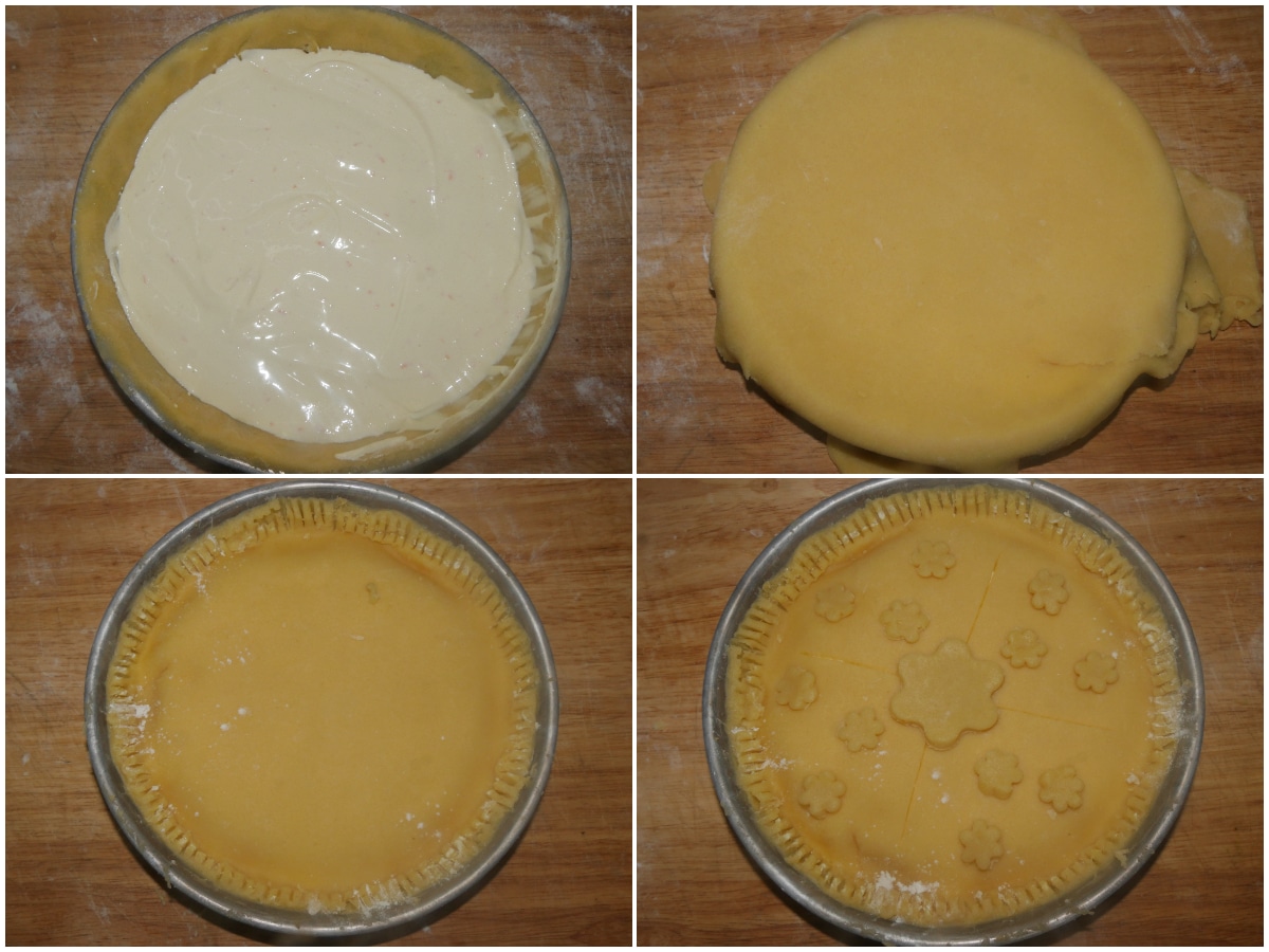 Versate la crema al mascarpone nel guscio di frolla, livellate la superficie e coprite con la seconda sfoglia.