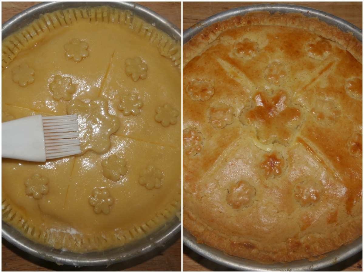 Pareggiate i bordi e sigillateli, quindi usate gli avanzi di frolla per creare dei decori e create qualche taglio con un coltello a lama liscia.