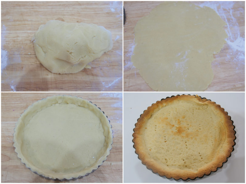 Una volta finito il riposo, riprendete la frolla, stendetela su un piano di lavoro leggermente infarinato e rivestiteci fondo e bordi di uno stampo per crostate imburrato.