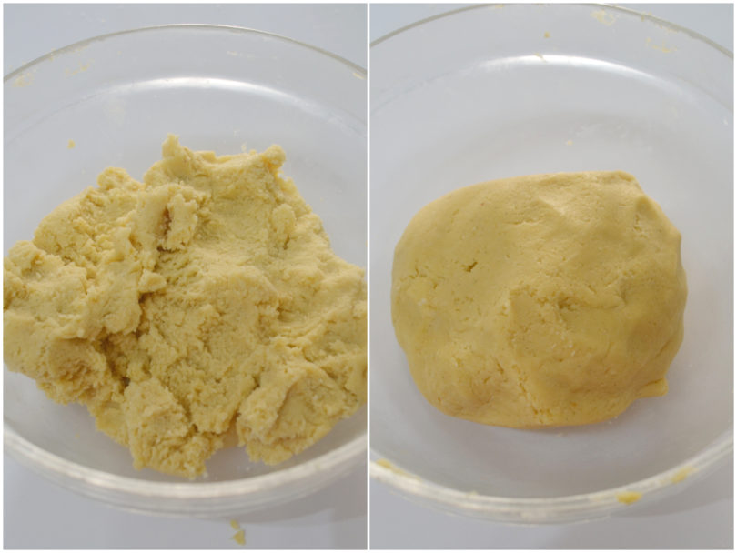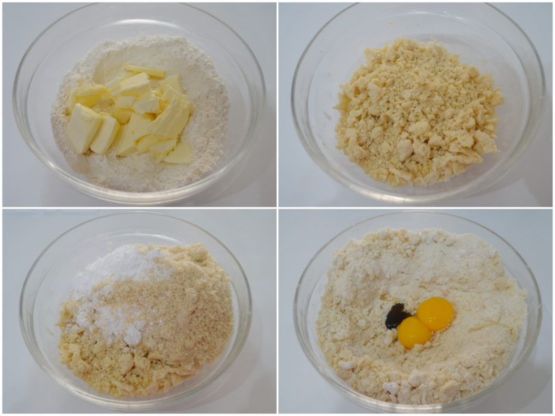 Innanzitutto preparate la frolla unendo prima le farine e il burro e poi anche zucchero, vaniglia, tuorli e sale.