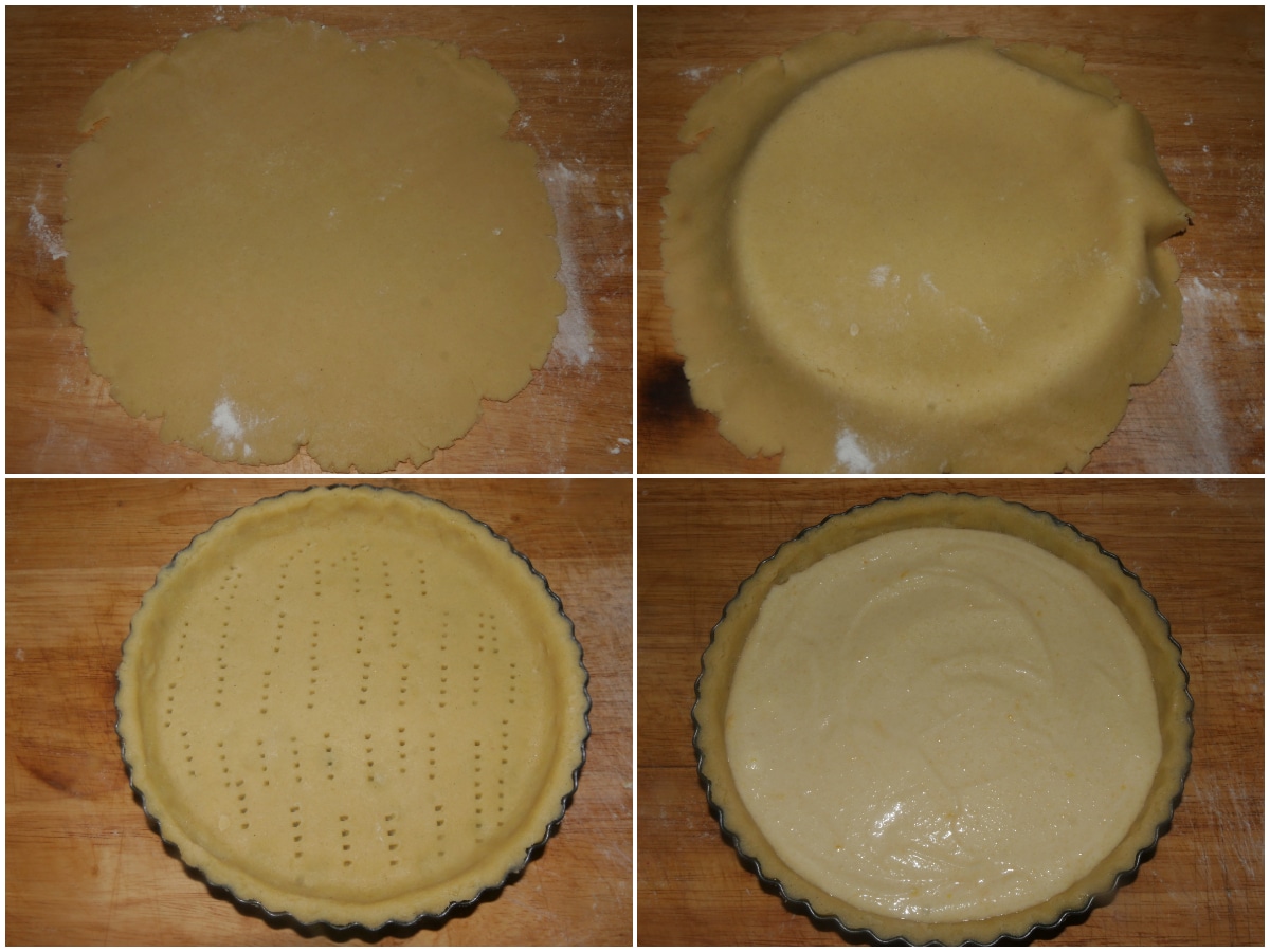 Riprendete la frolla, stendetela sul piano leggermente infarinato fino a creare una sfoglia di circa 5 mm, quindi trasferitela sullo stampo imburrato e infarinato, foderate bene e rifilate i bordi.