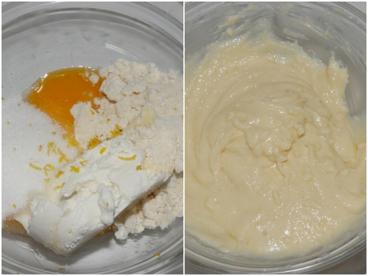 Preparate la farcia: mettete la ricotta, la farina di mandorle, il tuorlo, lo zucchero, il rum e la buccia di limone grattugiata in una ciotola e lavorate bene con le fruste, fino ad ottenere una crema ben omogenea.