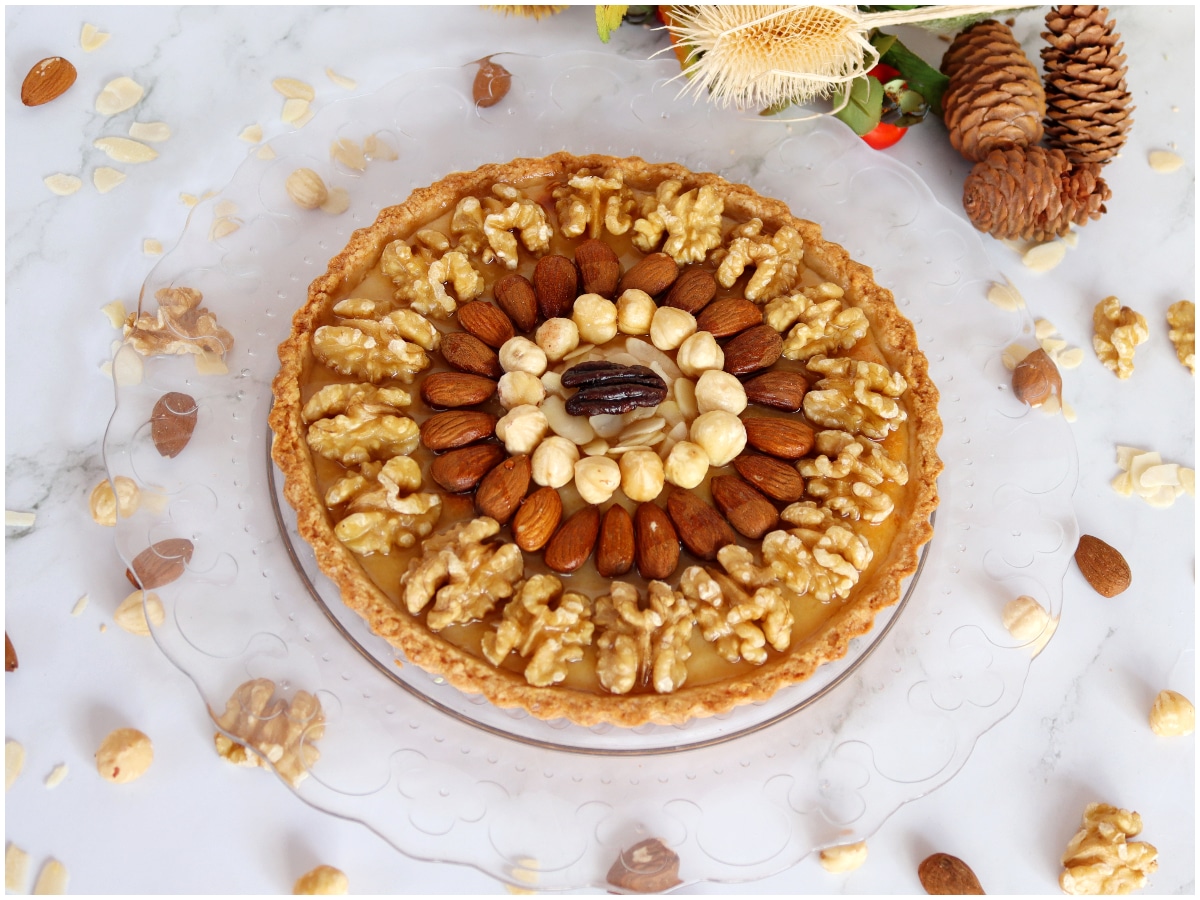 La crostata alla frutta secca è pronta: fate solidificare la gelatina prima di servirla.