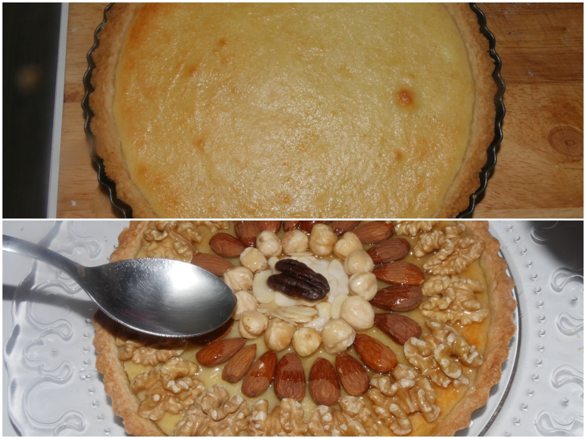 Decorate la crostata con la frutta secca disposta in cerchi concentrici, quindi usate la copertura come gelatina di copertura, versandola su tutta la superficie.