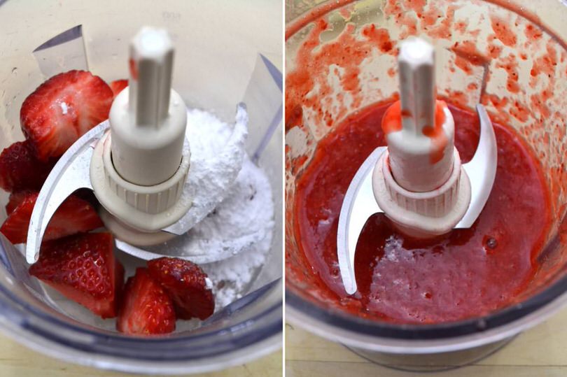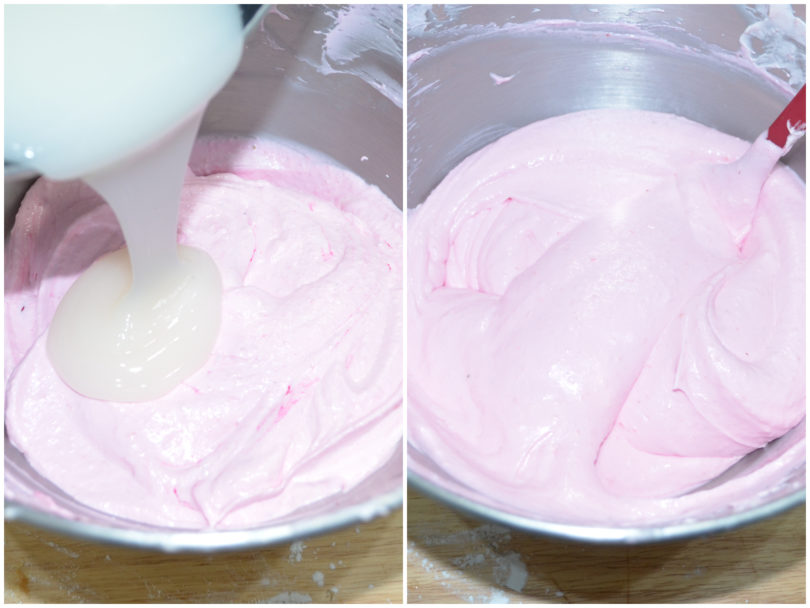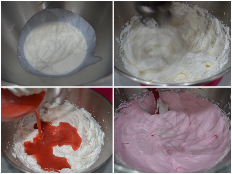 Incorporate delicatamente il frullato di fragole alla panna. Unite, se volete un colore più deciso, anche il colorante alimentare.