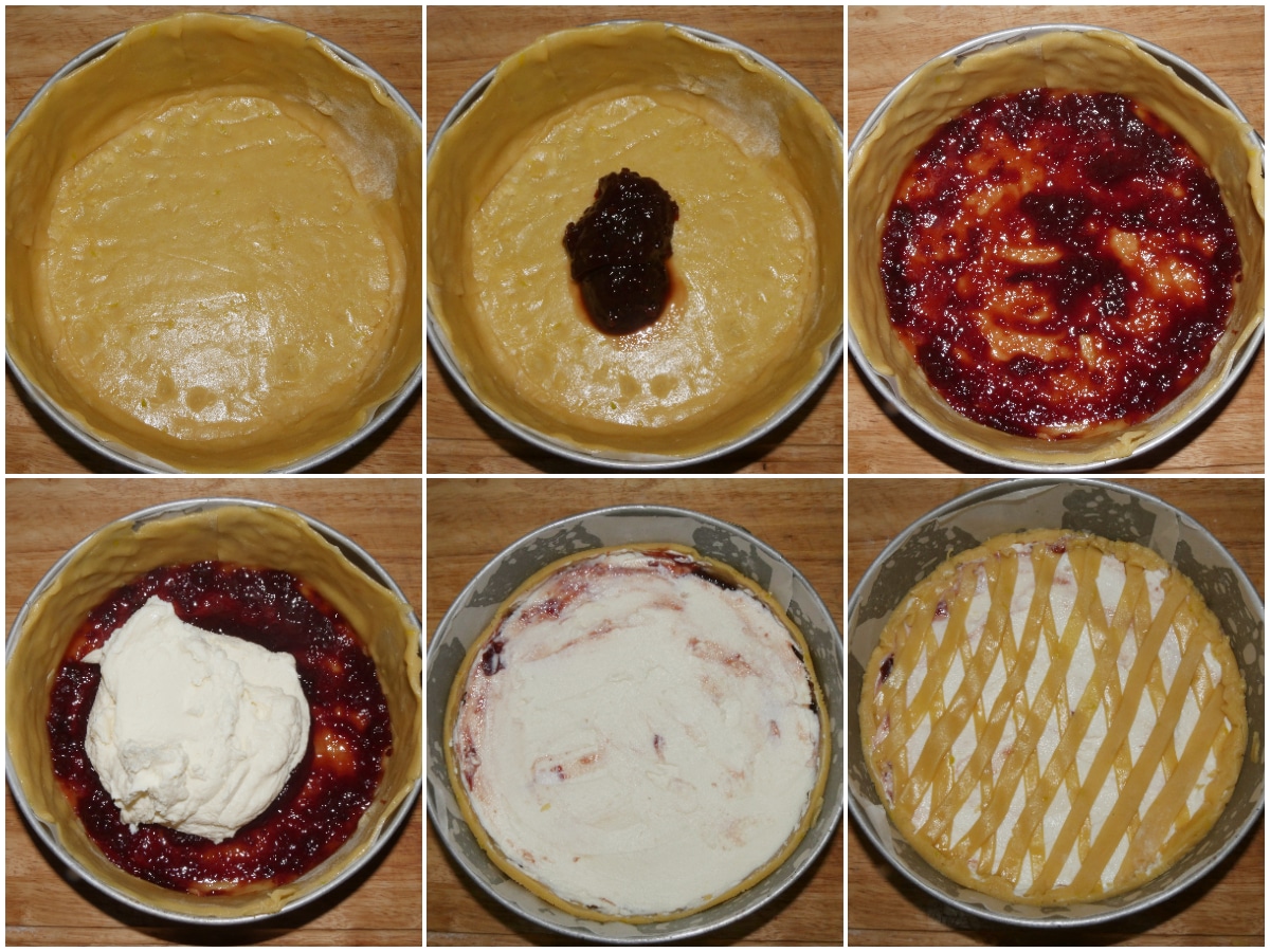 Assemblate la crostata: foderate bordi e fondo dello stampo imburrato con circa metà della frolla, distribuite qualche cucchiaio di marmellata sul fondo e coprite poi con la crema di ricotta, livellando bene la superficie, infine create la classica decorazione a losanghe con striscette sottili della pasta frolla rimasta e pareggiate i bordi.