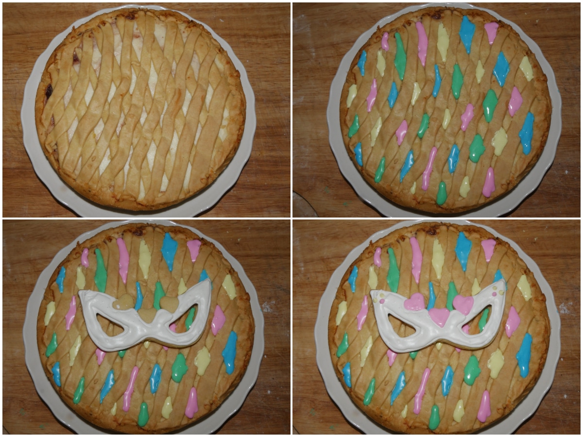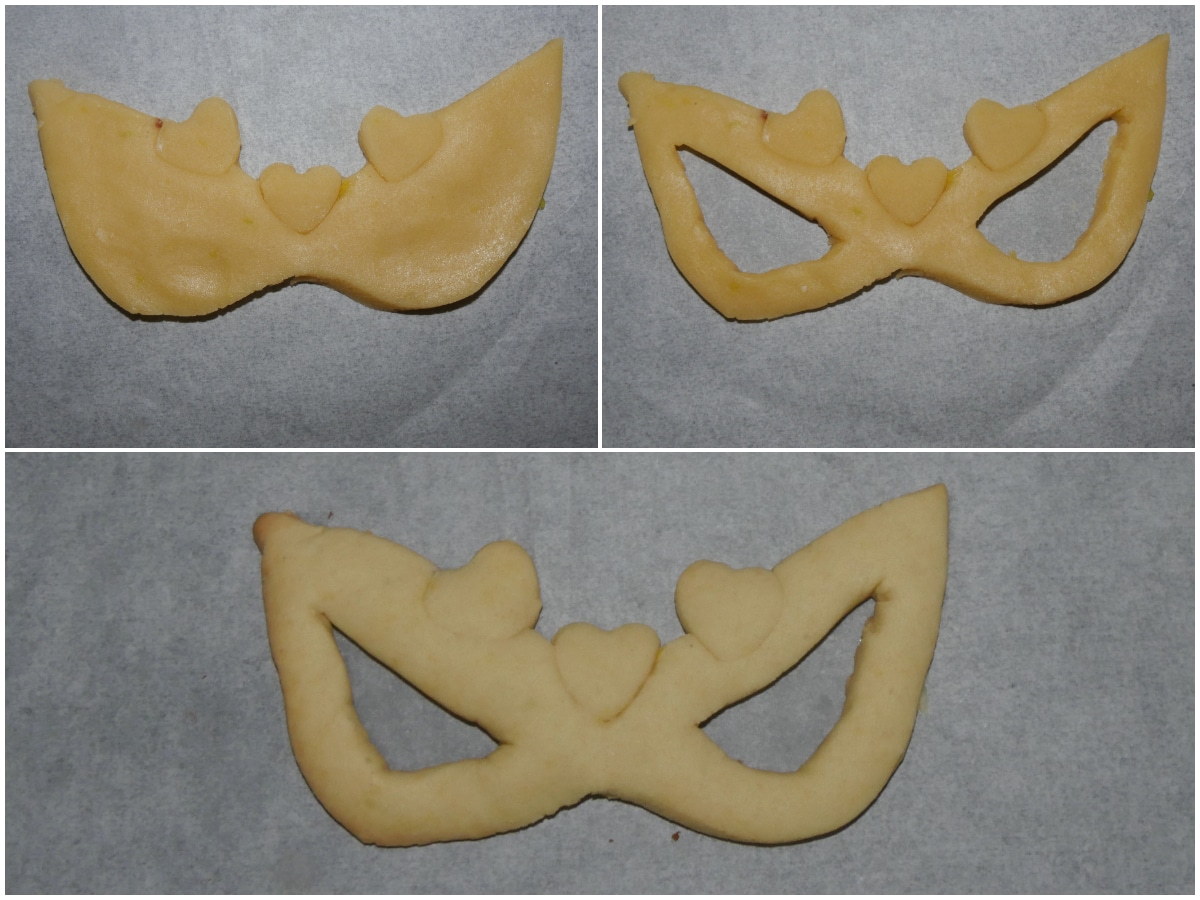 Create una maschera di Carnevale con gli avanzi di frolla e cuocete per 10-15 minuti o fino a doratura, sempre a 180°C (potete aprire l'anta del forno mentre cuoce la crostata e cuocerle insieme, tanto non è un dolce lievitato), quindi fate raffreddare completamente.