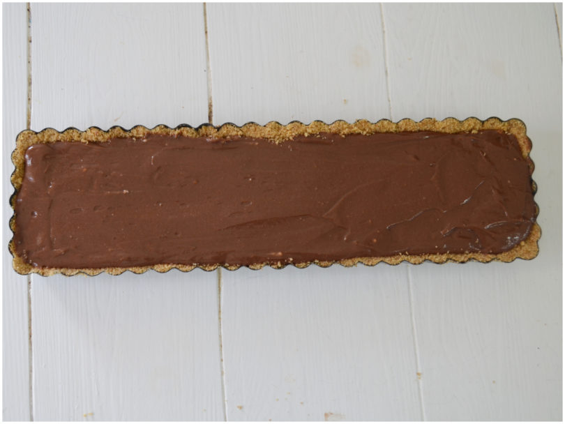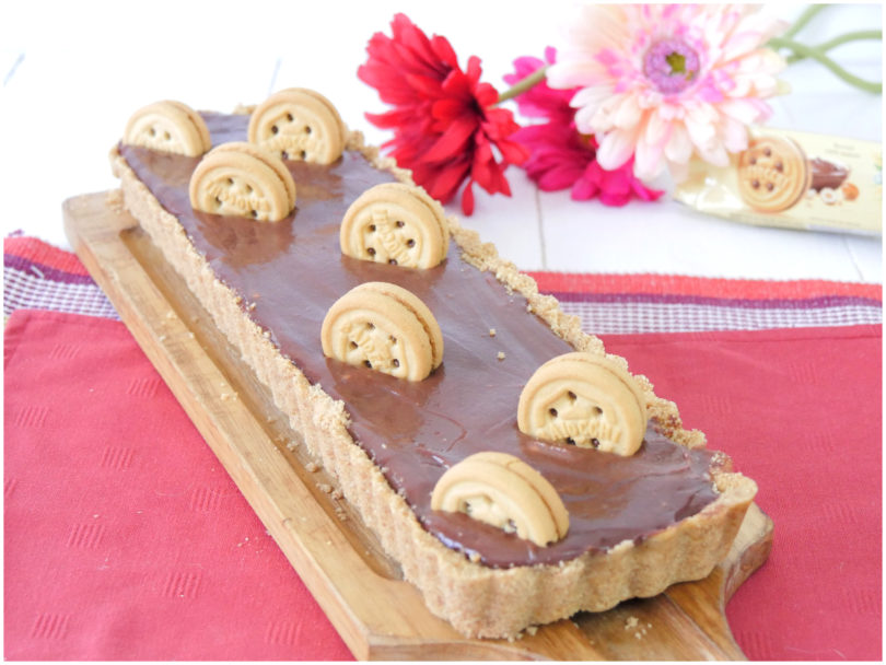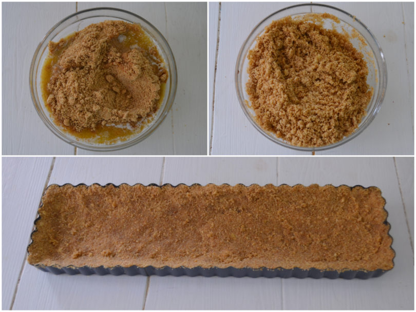 Sciogliete il burro e mischiatelo ai biscotti tritati, quindi usate il composto ottenuto per creare la base della vostra crostata, direttamente nello stampo con fondo rimovibile.