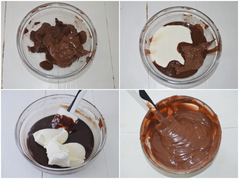 Nel frattempo preparate la farcitura: sciogliete la cremina dei baiocchi messa da parte insieme a metà della nutella, mescolando, quindi aggiungete la nutella restante e la panna.